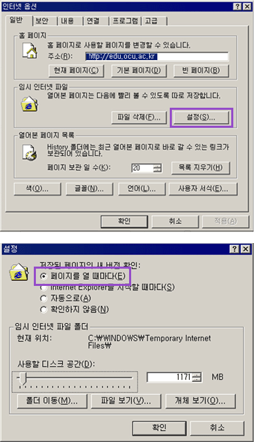 3. [ÀϹÝ]ÅÇÀÇ <ÀÓ½ÃÀÎÅÍ³ÝÆÄÀÏ>Ç׸ñÀÇ [¼³Á¤]À» Ŭ¸¯ÇÕ´Ï´Ù. [ÆäÀÌÁö¸¦ ¿¶§¸¶´Ù]¸¦ ¼±ÅÃÇÑ ´ÙÀ½ È®ÀÎÀ» ´©¸¨´Ï´Ù.