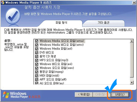 ¨ê Windows Media Player°¡ Àç»ýÇÒ ¼ö ÀÖ´Â ÆÄÀÏ Çü½ÄÀ» ÁöÁ¤ÇÑ ÈÄ ¡°¸¶Ä§¡± ¹öưÀ» ´·¯ ½Ã½ºÅÛÀ» Àç½ÃÀÛÇÏ°í ¼³Ä¡¸¦