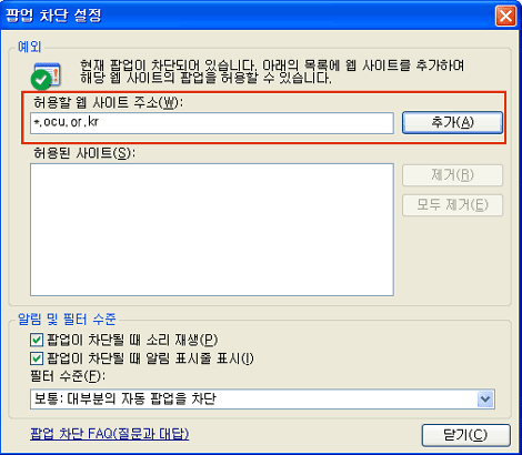 'ÀͽºÇ÷η¯' > 'µµ±¸' > 'ÆË¾÷Â÷´Ü¼³Á¤(P)' ¸Þ´º¸¦ ¼±ÅÃÇϽŠÈÄ, Çã¿ëÇÒ À¥»çÀÌÆ® ÁÖ¼Ò¶õ Çã¿ë¶õ¿¡ (*.ocu.ac.kr) (À»)¸¦ ÀÔ·ÂÇϰí Ãß°¡(A) ¹öưÀ» ´·¯ÁÖ¼¼¿ä.