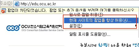 | 3. OCU »çÀÌÆ®¿¡ Á¢¼ÓÇϽŠ»óÅ¿¡¼ "ÆË¾÷ Â÷´Ü ¸Þ¼¼Áö"°¡ OCU »çÀÌÆ® »ó´Ü¿¡ ³ª¿À½Ã¸é »óÅÂÁÙÀ» Ŭ¸¯ÇϽŠÈÄ, 'ÇöÀç »çÀÌÆ®ÀÇ ÆË¾÷À» Ç×»ó Çã¿ë(A)'À» ¼±ÅÃÇϼ¼¿ä. |